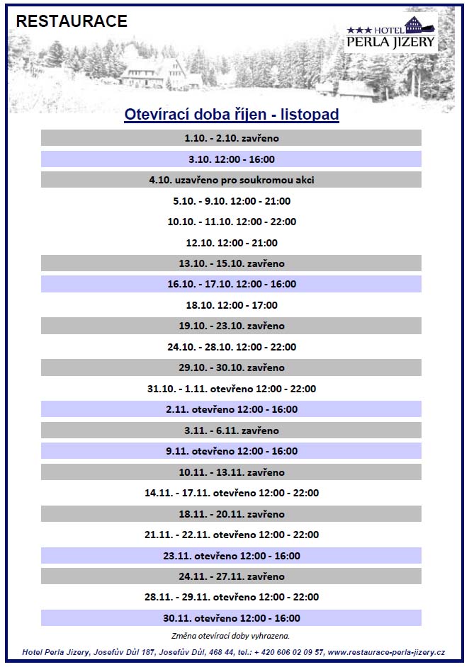 Otevírací doba restaurace Perla Jizery od 9.5. - 11.5. 2025